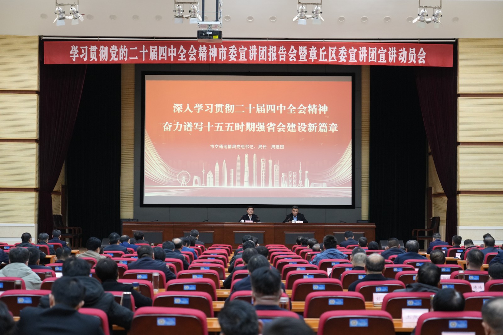 为深入学习贯彻党的二十届四中全会精神,在全区掀起学习宣传贯彻全会精神的热潮,11月26日下午,学习贯彻党的二十届四中全会精神市委宣讲团报告会暨章丘区委宣讲团宣讲动员会召开。市委宣讲团成员、市交通运输局党组书记、局长周建国到会作专题辅导报告。区委书记马志勇主持会议并讲话。