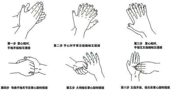 在流动水下,使双手充分淋湿,取适量洗手液(或肥皂)均匀涂抹至整个手掌、手背、手指、指甲缝和指缝,按照“六步洗手法”(如图1)认真揉搓双手,具体步骤如下:
