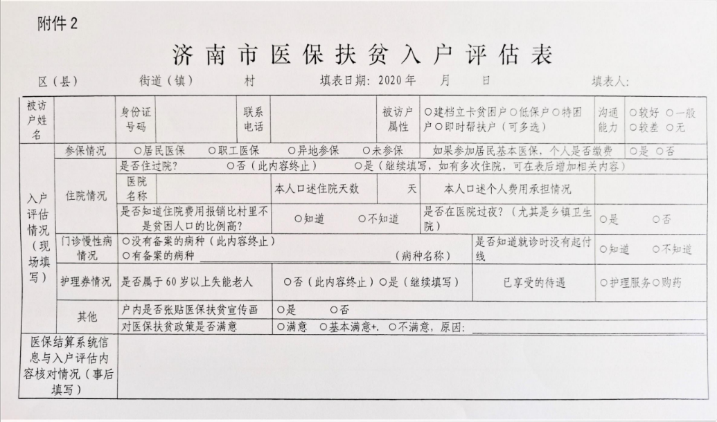 检视巡查组:采取“四不两直”、随机抽查的方式,到医保扶贫对象家中,调查医保扶贫对象参保情况、待遇享受情况、费用结算情况、政策知晓情况等,并填写《济南市医保扶贫入户评估表》(见附件2),对检视过程中发现的问题及时反馈给待遇保障组。