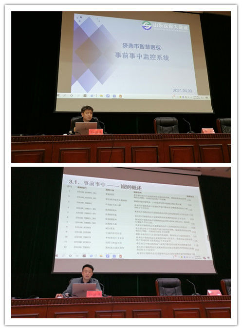 会议邀请山东省互联网医保大健康集团有限公司负责人介绍山东省互联网医保大健康服务平台建设情况,通过链接定点医疗机构收费系统、医生工作站、护士工作站,将医保审核关口前移,在医疗行为发生的事前进行提醒、事中进行预警,监管前移,实现对定点医药机构的全流程动态管理,并对智能审核系统进行了规则介绍及操作演示。